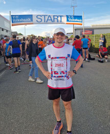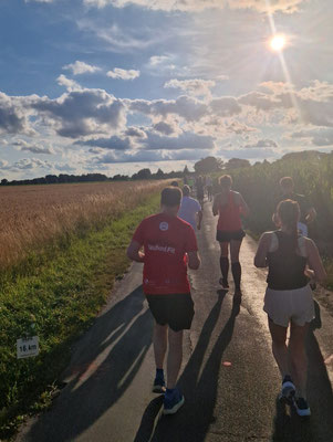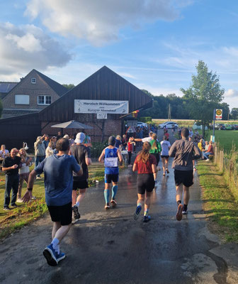Ich war natürlich für den Halbmarathon gemeldet. Der geplante Start war um 19:00 Uhr. Minuten vorher tummelten sich die Teilnehmer hinter dem per Hand aufgezogenen Startbanner. Und dann erklang pünktlich das Startsignal. Ich nenne es mal bewusst Signal, weil in der letzten Zeit kaum irgendwo mehr mit der Startpistole geschossen wird. Schade eigentlich. Beim Halbmarathon waren 336 Finisher am Start und so tummelten sich auf den ersten Metern 672 Füße auf dem engen Wirtschaftsweg.