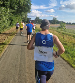 Beim Versuch am Anfang mein Tempo zu finden, fiel mir ein Läufer auf, der sich am Rücken ein Schild drangeheftet hat. Bei diesem Lauf gibt es keine Pacemaker, aber dieser Läufer wollte einer sein. Seine verkündete Zielzeit war unter 1:45 Stunden, was eine Pace von knapp unter 5:00 bedeutet.