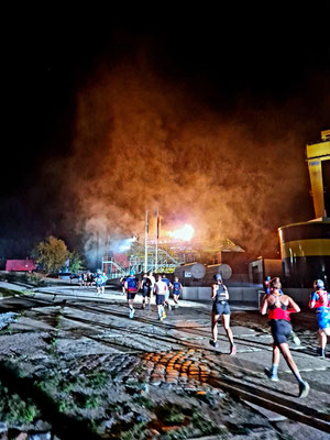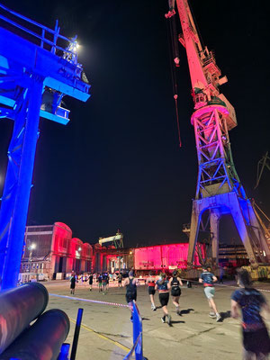 Bei etwa Kilometer 6 kommt aber das Highlight der Stecke. Die Strecke führte durch die Stettiner Werft, ein ehemaliges Schiffsbauunternehmen. Zu der Werft gibt es sonst keinen Zugang. Nur für den Marathon wird die Werft für die Läufer geöffnet. Dabei werden die Gebäude, Hallen und gigantischen Kräne in den unterschiedlichsten Farben illuminiert. Es war ein sehr beeindruckender Anblick zwischen den hohen Kränen zu laufen.