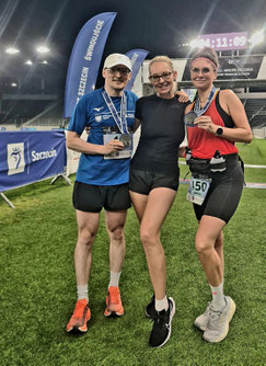 Erschöpft nach knapp 3 Stunden und 47 Minuten, ließen wir uns dann auch im Ziel feiern. Zufrieden mit der tollen Zeit, mit den tollen Erlebnissen und dem besonderen Nachlauf. Als Krönung gab es eine tolle Medaille, die richtig was her machte. Darauf ist ein Werftkran zu sehen, der an der Stelle eines Greifers einen Bernstein hat. Sehr typisch für die Ostsee. Definitiv eine der schönsten Medaillen in meiner kleinen Sammlung. Nach dem Zieleinlauf gab es noch Erinnerungsfotos und ein geselliges Beisammensein von uns vieren. Und der Veranstalter hatte für die Teilnehmer zum Stärken und Aufwärmen auch noch warmes kostenloses Essen vorbereitet. Zwar leider keine Bratwürstchen, aber immerhin Pasta mit zwei unterschiedlichen Soßen. Das tolle Marathon-Nachterlebnis endete dann irgendwann morgens früh im Bett, wo von weiteren Läufen geträumt werden durfte...